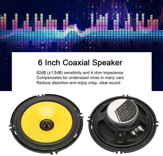 Feature: 1. [Professional Sound Quality] Premium car speakers, and innovative design, the blend of large speakers and high powered drivers to provide better sound. 2. [Heat Dissipating Voice Coil] Car speaker voice coil with a heat sink design that handles extreme heat and maintains its structural integrity, thus extending the life of the speaker. 3. [Reduced Distortion] Car door speaker has 92dB ( 1.5 dB) sensitivity and 4 ohm impedance to compensate for the undersized wires in many cars. Reduce distortion so you can enjoy crisp, clear sound. 4. [600W High Power] Treble bass 6 inch coaxial car speaker system with maximum power output of 600W, you can play your favorite songs as you like and with. 5. [Stereo] This coaxial speaker has a frequency response of 30Hz36KHz (20dB), completing your current car midrange speaker enclosure system for full stereo sound.