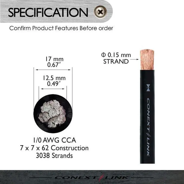 Stranded CCA ( Copper Clad Aluminium ) Conductor with PVC Jacket ^^ Full 1/0 American Wire Gauge, 3038 Strands of CCA ( 0.15 mm) for Conductor ^^ Come in One Continuous Length ^^ High Resistance to Heat, Oil, Chemicals and Abrasion ^^