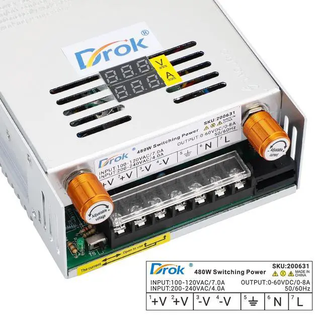 Voltage range: DC 0-60V. This supply is suitable for 3V 5V 6V 9V 12V 24V 36V 48V 60V devices. The voltage precision is 0.1V. NoteThe maximum current is 8A. But the ouput current can be adjusted by the potentiometer. No matter how many voltage is adjusted, the max current should not be higher than 8A. It can be used to device of 2A 3A 5A 8A. Make sure to use the devices which is below 8A. ^^ Hareware This Buck Converter is equipped with LED screen, heat sink and cooling fan. The LED screen can clearly display the output voltage and output current. Heat sink and cooling fan can control the temperature in a safe range. During the running power is high, the cooling fan will automatically activate with little noise. ^^ Easy Operation This supply is no need to install, after connecting wire, it can be used to adjust output, which is convenient. The potentiometer is inset into the supply. Only to rotate the potentiometer can adjust output parameter. ^^ Protection Over Load Protection, Over Voltage Protection, Short Circuit Protection, which can protect your device from damage.