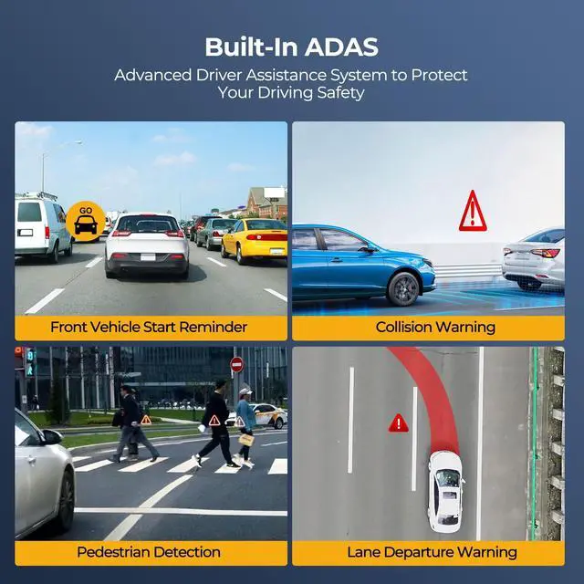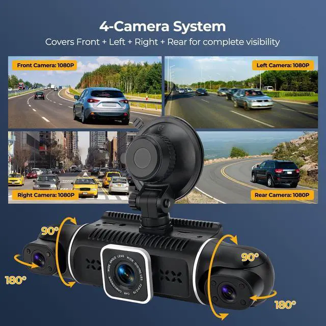 stay connected and share your driving experience anytime, anywhere. ^^ [Automatic Collision Detection] The integrated g sensor automatically saves and locks accident footage upon collision detection, providing invaluable evidence and peace of mind in case of incidents. protect yourself with this essential safety feature. ^^ [Experience Comprehensive Coverage] Our 4 channel dash camera with 1080p hd resolution ensures every angle of your journey is captured for safe driving. the large 3.0 -inch screen provides a clear view for easy review while driving, enhancing road awareness with minimal distraction.