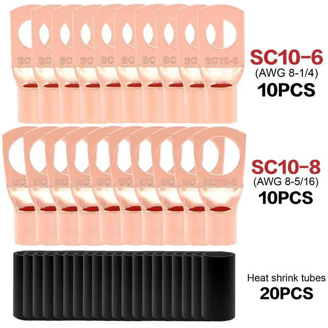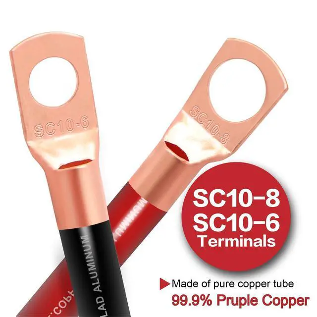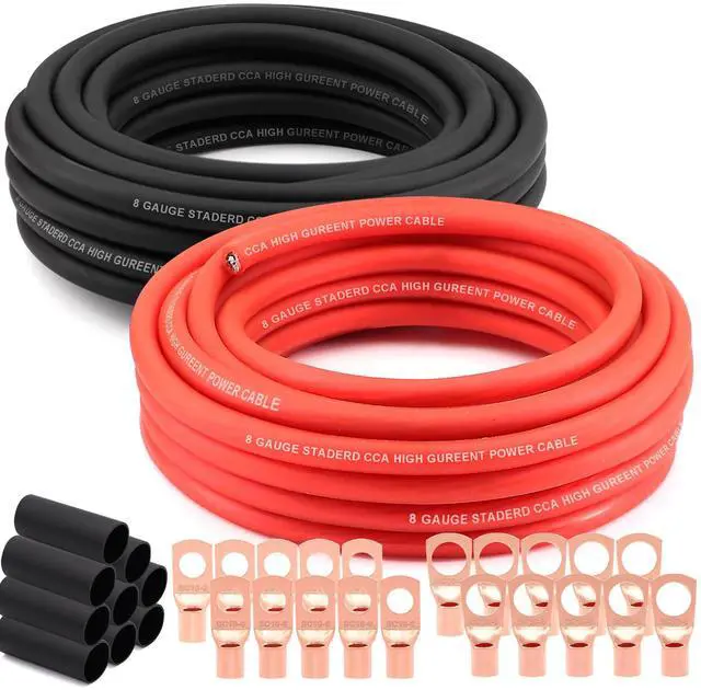 ^^ RUGGED PVC JACKET - Low memory, flexible soft-touch jacket material is perfect for routing in hard to reach places, designed for the electrical and auto repair installer in mind. Strong, yet durable pvc jacket has has flexibility, elasticity, and impact resistance built in, is resistant to extreme temperatures, liquid, oil, gas, abrasions and high impact. ^^ PACKAGE - 2 pcs 8 gauge black/red CCA power ground wire (25 feet of each color) 10pcs SC10-6" Battery Lugs10pcs SC10-8" Battery Lugs20pcs 2:1 Dual Wall Adhesive Heat Shrink Tubing.
