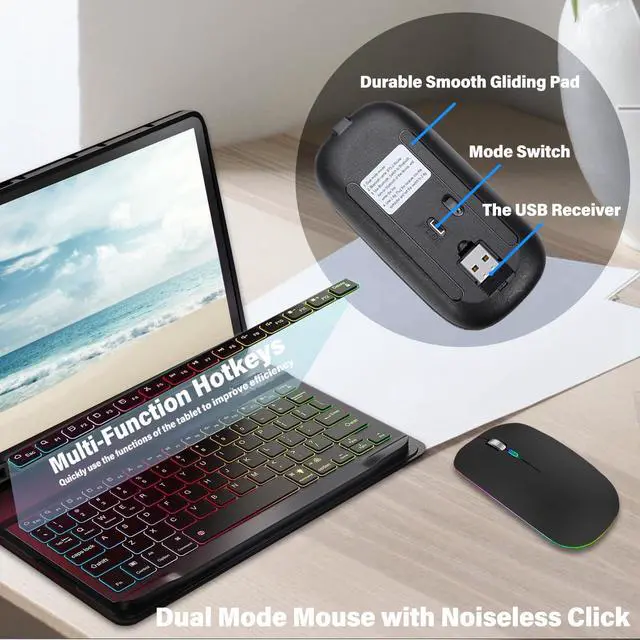 The keyboard will automatically enters power saving mode when not in use. The first row of the keyboard has functional shortcut keys, which can more effectively improve efficiency. ^^ Screen Protector & MouseDurable 9H hardness material surface help prevent scratches to the screen. Provides maximum protection for the extra touchscreen surface and not affect its daily use. The mouse has a comfortable and non-slip wheel that slides smoothly, whether it is clicking, scrolling or browsing the web, it can easily cope with it. Slim body, easy to carry. ^^ Full Protection CaseDurable premium PU leather cover and anti-slip rubber-lined interior provide full protection for your tablet to avoid the damage from dust, water, collisions, etc.