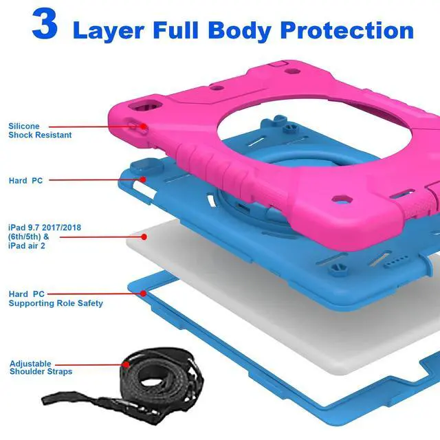 Precise Cutouts: The new iPad 9.7 case is made of high quality TPU and non-slip silicone, which is not only shock/shock/durable to provide full body protection for your 6th/5th/ generation iPad, but also keep your grip comfortable. All ports have precise cutouts for easy access to all buttons, speakers, cameras and sensors. ^^ 100% Satisfaction Customer ServiceWe provide this ipad case 9.7 inch Case with free adjustable shoulder straps to make it easy for you to use your iPad while traveling outdoors, working and playing with your kids. If you have any questions about our ipad case, please contact us immediately. We will definitely give you a satisfactory answer! The colorful colors are suitable for all ages. Ideal gift for birthdays, Valentine's Day, Christmas or other special occasions.