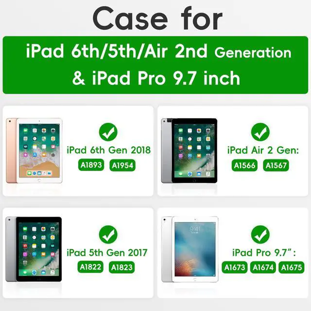 Compatibility: Case only for iPad 6th/5th Generation 9.7 inch (A1893/ A1954/ A1822/ A1823) 2018/2017 Release, iPad Air 2 (A1566/ A1567) and iPad Pro 9.7 (A1673 / A1674 / A1675). Please Check the bottom of your iPad to find the model number. Or visit ANDNARY to choose the right case for your iPad. ^^ 360