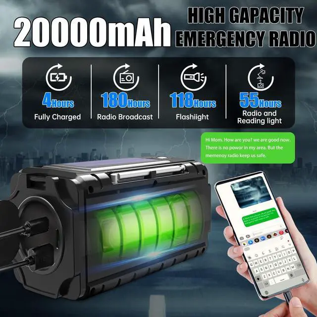 Power Options: Features a massive 20000mAh battery radio with multiple charging methods including hand crank, solar panel, and Type-C charging for reliable power during emergencies. Emergency source keep in tough with anyone.