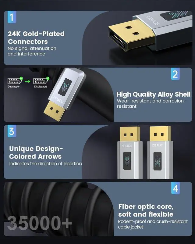 ^^ Born for Enthusiast eSports GamersThis DP 2.1 cable is a four-core optical fiber with multiple internal shielding and a latch-free design. The 24K gold-plated connector is anti-corrosion and more durable. It has high anti-electromagnetic interference and anti-RF interference capabilities and can withstand more than 35, 000 times. Bend tested without affecting cable flexibility and ensuring optimal performance. ^^ Wide CompatibilityOur display port 2.1 AOC can be used on all devices with DisplayPort interfaces. Plug and play, backward compatible with DisplayPort 2.0 / 1.4 / 1.3 / 1.2 / 1.2A / 1.1 / 1.0.