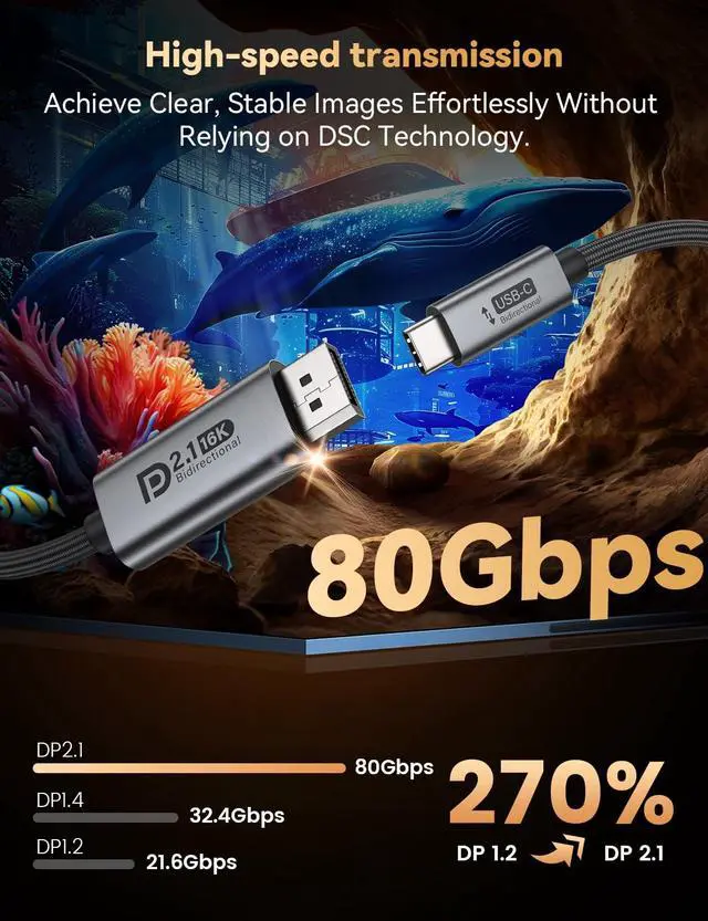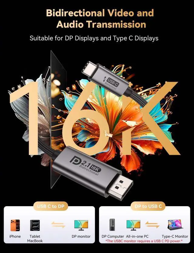 The high-quality copper core optimizes dark images in the game and improves detail. ^^ Bidirectional Universal compatibilityThis bidirectional USB-C to DisplayPort cable supports two modes. In USBC to DP mode, it is compatible with MacBook Pro M4/M3/M2, iMac, iPad Pro/Air/Mini, Samsung Galaxy S25/S24/S23 Ultra, Galaxy Tab S10/S9/S8, Lenovo/HP/Dell/ASUS laptops, Steam Deck, iPhone 17/16/15 and other Thunderbolt 5/4/3 devices with DP The old old fashion to connect with DP enabled TVs, monitors and projectors. In DP to USB-C mode, it works with desktop PCs, Nvidia graphics cards, AMD graphics cards, Dell UltraSharp U2723QX/U2723QE, ASUS XG27UCG/XG27UCS, LG Ultra 5K/4K and other DP sources for connecting portable USB-C displays.