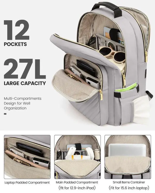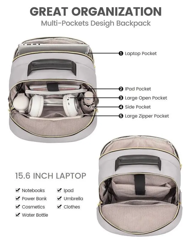 Spacious & OrganizedThis backpack purse for women is perfect for women who need a lot of storage space. With four compartments and multiple pockets, it offers plenty of room for your laptop, books, files, and other essentials. It also has a hidden pocket on the back panel for storing valuables. ^^ Fits 15.6 -Inch LaptopsThe laptop backpack is designed to fit laptops up to 15.6 inches, with a separate padded compartment to protect your device from scratches and bumps. The interior is lined with soft fabric to keep your laptop and other items safe and organized.