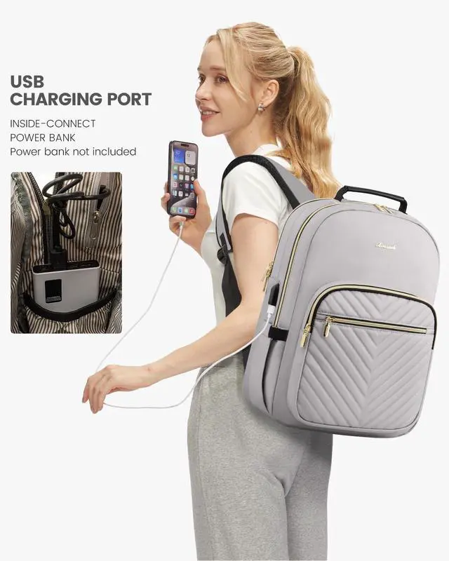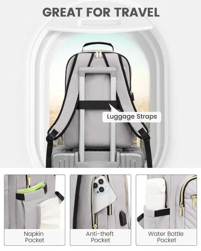 ^^ Soft and Durable MaterialMade of soft composite nylon fabric and stripe lining, this backpack for women is not only stylish but also durable and water-resistant. It can protect your laptop and other belongings from rain and moisture. ^^ Convenient FeaturesThe travel backpack for women comes with a luggage strap, making it easy to attach to a suitcase or carry-on bag. It also has two side pockets for water bottles and tissue papers, allowing you to stay hydrated and prepared on the go. ^^ Comfortable to WearThe work bags for women features padded shoulder straps and a cushioned back panel for optimal comfort and support.