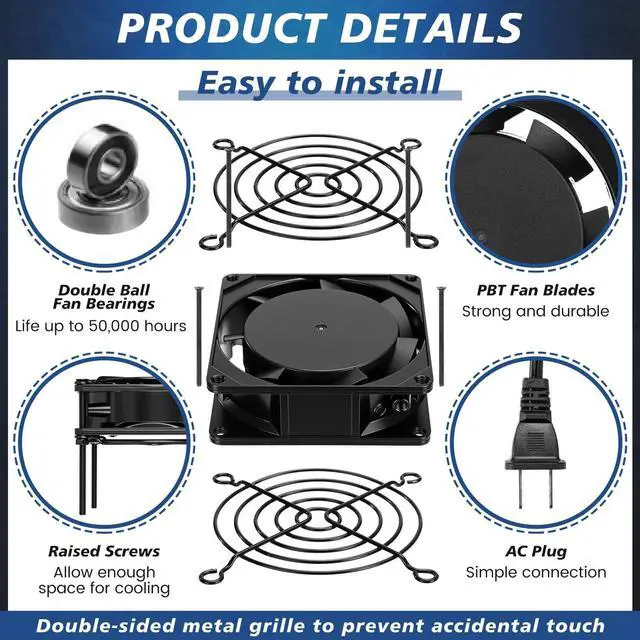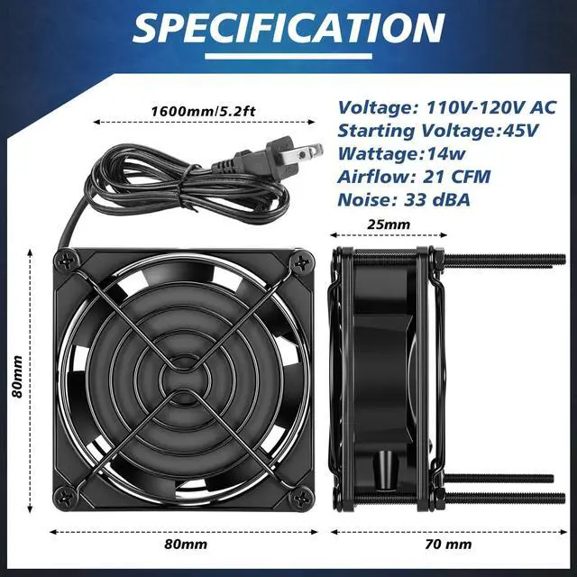 Features: We understand that size is important and thus, we have ensured that each of the 120mm fans is small, compact, and fits seamlessly into your space. Measuring just 3.15 x 3.15 inch / 80 x 80 mm, the cooling fan for computer fit right where you need them without altering the aesthetic of the location. One of the standout aspects of the brushless AC cooling fan is the waterproof design. Its internal components, their blades are waterproof, enabling them to resist water deforms. The fans' waterproof body ensures safety and stability of operation in high humidity environments.
