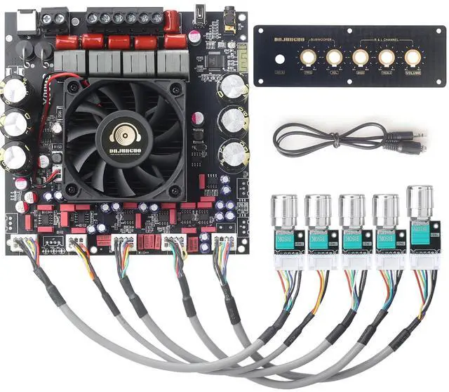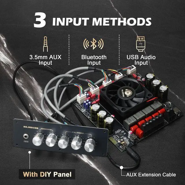 MULTIPLE INPUT METHODThe S600X-W has multiple input methods such as Bluetooth input, AUX input, USB flash drive input and USB sound card. The vast majority of devices can be used, such as mobile phones, televisions, laptops, etc. ^^ DUAL TPA3255 CHIPThe S600X-W is equipped with two TPA3255 chips for stereo 2.1 channel output, with a maximum output power of up to 300W * 2+600W and a wide voltage input DC of 19-51V. ^^ Panel DesignThis wired amplifier board comes with a DIY small panel, allowing you to easily create a Bluetooth speaker without the hassle of drilling holes.
