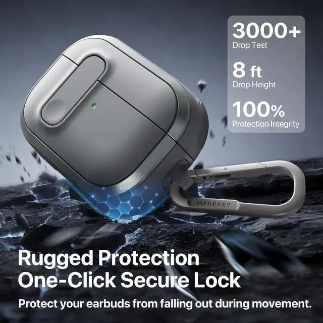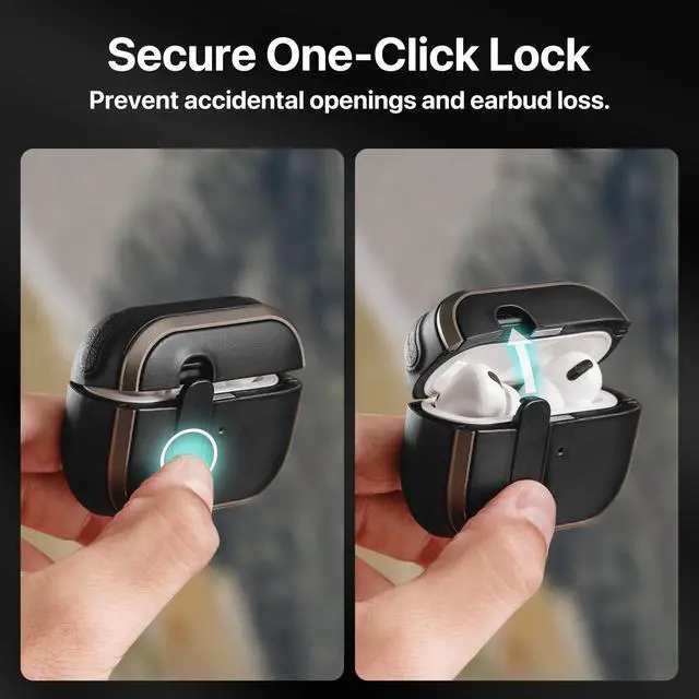 SECURE LOCK WITH ONE-CLICK RELEASE: The built-in locking mechanism prevents accidental lid openings and keeps your earbuds securely inside during movement or travel. The one-click release button provides smooth, effortless access whenever you need your AirPods. ^^