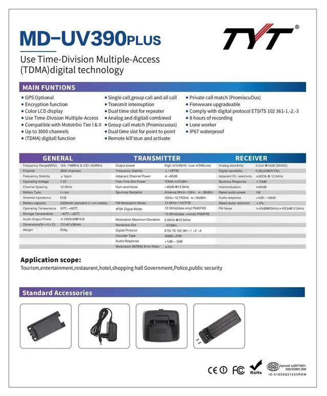Package includes: TYT MD-UV390 TYT Handheld Radio, 7.4 V 2800mAh Li-ion Battery Pack, Belt Clip, Adapter, Desktop Charger, Driver & Software CD, Programming Cable, User Manual
