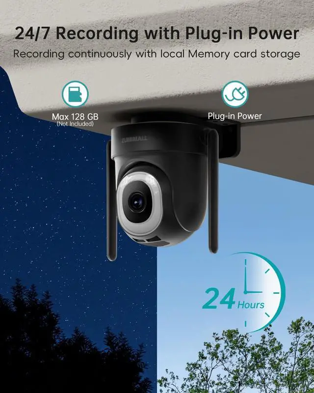 355 Auto-Tracking & Motion DetectionThis PTZ camera offers 90 vertical and 355 horizontal rotation for 360 blind-spot-free monitoring. It auto-tracks moving targets, records activity, and sends real-time app alerts when motion is detected. Supports 24/7 continuous recording with automatic overwrite of old footage when storage is full, ensuring non-stop surveillance ^^ 24/7 Recording with Cloud & No-Monthly-Fee SD StoragePowered by a 3-meter plug-in cord, this outdoor camera enables 24/7 recording. Choose between a no-monthly-fee Micro SD card (up to 128GB, not included) or premium cloud storage for 24/7 recording ^^ 3MP Color Night Vision & Built-in FloodlightFeaturing 3MP resolution for sharp, clear visuals, this camera comes with a built-in floodlight that provides 33ft color night vision.