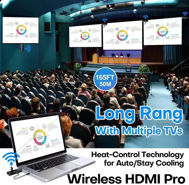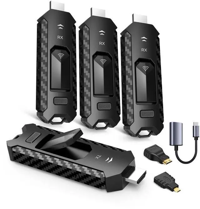 Asin: B0DPDBYNCQ. ^^ Next-Gen 5G Chip, Heat-Control TechnologyEquipped with an updated 5G chip and heat-control technology for Automatic Cooling, Wireless HDMI to Multiple TVs ensures stable connectivity and prevents overheating even during extended use. Enjoy uninterrupted streaming even in crowded environments, making it perfect for meetings, classrooms, churches, conference rooms, restaurants, and family gatherings. ^^ Plug and Play, 5.8G / 2.4G Unfold AntennasPre-paired HDMI Transmitter and Receiver sets ensure easy setup. Operate on the 2.4G / 5.8GH z Dual-Band frequency- No apps, drivers, or Wi-Fi needed. Simply connect and start streaming- will automatically sync within seconds. Wireless HDMI transmitter and receiver Unfold Antennas enhance signal strength stronger and stability. ^^ @60Hz High Screen Refresh Rate- Only 0.1 s Latency Enjoy real-time, lag-free video and audio streaming @60Hz with an ultra-low 0.1 s latency. Powerful 5G chip provides stable, real-time, lag-free high-quality visuals, effortlessly to various scenarios, whether gaming, live sports, s on multiple large screens. HDMI Sender and Receiver Wireless connectors deliver stable performance across various scenarios. ^^ Long-Transmission Range with Multiple TVsEnjoy reliable, high-quality streaming with a 165FT/50M transmission range in open environments (with no barriers) and advanced 5G technology that maintains connectivity up to 50FT/15M through walls (avoid thick walls or large obstacles).