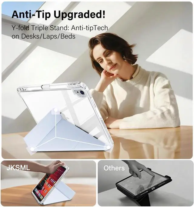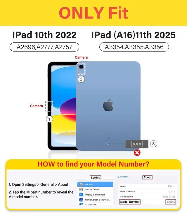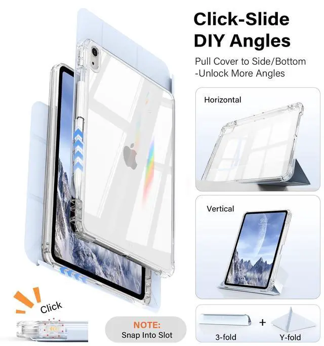 Generation 10.9 -inch (2022): Models A2696/A2757/A2777. Confirm back "A" number before choosing this case to protect your investment. ^^ Fully Clear Hard backShow off your iPad's original sleek design with a fully transparent back that shines in sunlight. This iPad a16 case is perfect for personalizing with your favorite stickers or photos, making it uniquely yours. ^^ 8+ Viewing AngleA revolution in flexibility. This 2 in 1 sliding cover for the iPad 11th gen case works on 2 sides with 2 folding modes, creating 8+ angles. Perfect for watching, typing, or video calls. Say goodbye to limited views. ^^ Anti-tip Y-fold StandThe unique Y-fold design creates a wider, more stable triangle than old tri-folds. It won't tip over even when you type/press hard, keeping your i Pad 10th gen case steady on your lap, desk, or soft bed surface, etc. ^^ Shield Eco-fabricMade with advanced eco-material, the iPad 11-inch case resists stains, scratches, and fingerprints. Its textured surface provides a secure, anti-slip grip. Spills wipe away easily, keeping your case clean and iPad safe. ^^ 360 stable protectionThis iPad 11th gen case offers all-around security.