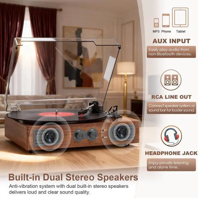 Upgraded Sound for Better Vinyl Listening-Built-in dual stereo speakers deliver clearer mids bass than other typical entry-level models. The belt-drive system reduces vibration for smoother, cleaner playback, making it ideal for dorm rooms, bedrooms, and offices. ^^ Treble & Bass Control for Personalized Sound -Fine-tune your music with adjustable treble and bass knobsshape the sound to match your room, mood, or favorite vinyl style. A feature many entry models dont offer. Build-in Bluetooth receiving function allows you connect to Bluetooth devices wirelessly such as smartphone, tablets. ^^ 3-Speed Support for Your Entire Vinyl Collection -Enjoy 33, 45, and 78 RPM playback for 7", 10", and 12" records.
