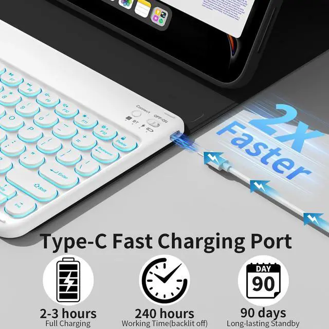 ^^ Long Life Battery Rechargeable KeyboardiPad keyboard Built-in powerful 420mAh battery and enters energy-saving mode automatically if not in use for 15 minutes, which worry-free use and long standby time. Using a Type-C charging port of keyboard charges faster, only 2-3 hours full charge.