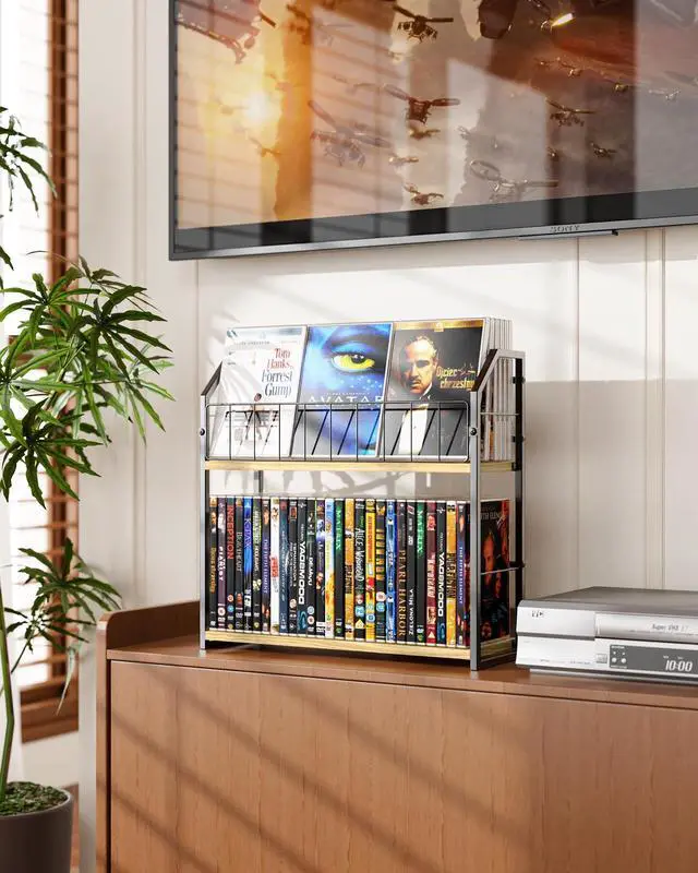 High-Capacity DVD Storage: Our DVD shelf organizes your entire DVD collection with two-tier design. This DVD case solution holds 56 DVDs total (29 below, 27 above) and provides reliable support as a sturdy DVD rack with 10lb per tier capacity ^^