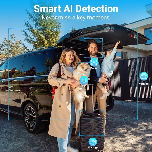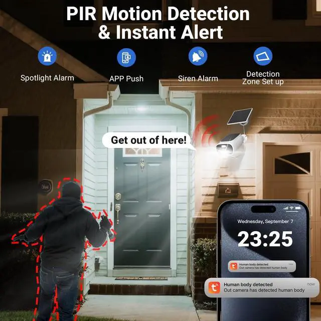 Plus, the 6x digital zoom magnifies distant objects so you can easily see important details ^^ Stable Dual-Band WiFiSupporting both 2.4GH z and 5GHz WiFi bands, this solar camera outdoor wireless offers flexible and stable connectivity. The 2.4GH z band delivers long-range coverage, while the 5GHz band ensures faster transmission speeds and reduced interference, ensuring optimal performance no matter where the wireless camera is installed. ^^ AI Motion Detection & Instant AlertsEquipped with advanced AI technology, the cameras for home security intelligently and precisely distinguish between people and animals, drastically minimizing false alarms.