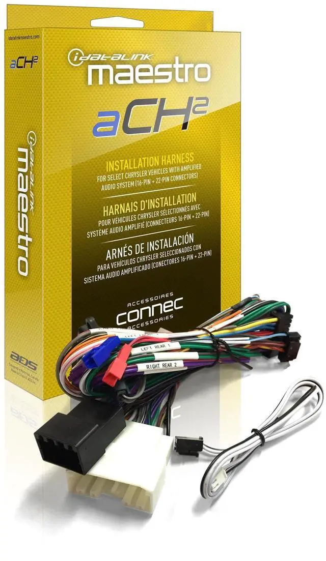 aCH2 Plug and Play Amplifier Harness for Chrysler, Dodge, Jeep Vehicles. Replace your factory amplifier with a more powerful aftermarket amp (Maestro AR amplifier replacement module required).