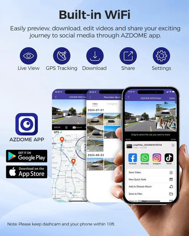 WiFi & GPS: With built-in WiFi, M550 Max dashcam is compatible with AZDOME app, which allows you to access recorded videos and photos instantly on your phone, and share your travel scenery and moments while on the go. Built-in GPS allows you to track your driving route and location via the app or AZDOME GPS Player, offering crucial evidence in case of accidents. ^^ 3 Parking Modes for 24/7