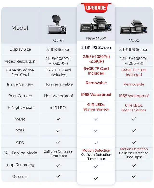 Rear Inside: The new AZDOME M550 dash camera delivers crystal-clear 4K footage from the front and upgraded 2.5K footage from the rear. With 150 views of the front, cabin, and rear, this triple dashcam records simultaneously in 2.5K +1080P+ 2.5K, ensuring 360 protection. It's the perfect companion for Uber drivers and families on memorable road trips.