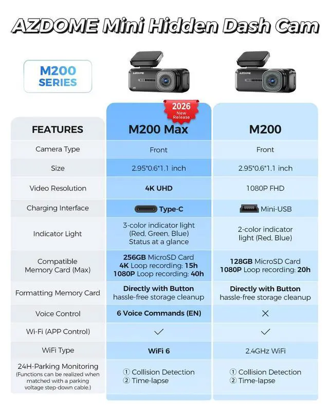 ^^ Important Note: M200 Max car dash camera does not come with an MicroSD card. A high-endurance MicroSD card (Class 10 or above, up to 256GB) is required to start recording. AZDOME 128GB or 256GB card not included, sold separately via