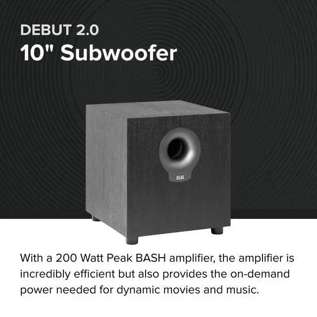 POWERFUL SUBWOOFER - S 10.2 is the perfect complement to the Debut 2.0 loudspeakers, adding powerful bass that you can feel and hear. Built to deliver huge performance, the compact design allows placement in almost any part of your room. ^^ BASS THAT BRINGS SOUND TO LIFE - With 200 Watts built in, theres plenty of power to deliver rock-solid low frequencies that make your favorite audio come alive with the weight and presence of a live performance. ^^ ON DEMAND POWER - A 10-inch long-throw custom bass driver and 200-Watt Peak BASH amplifier provide the quality and quantity of sound that is fundamental to accurately reproducing todays demanding movie soundtracks and music.