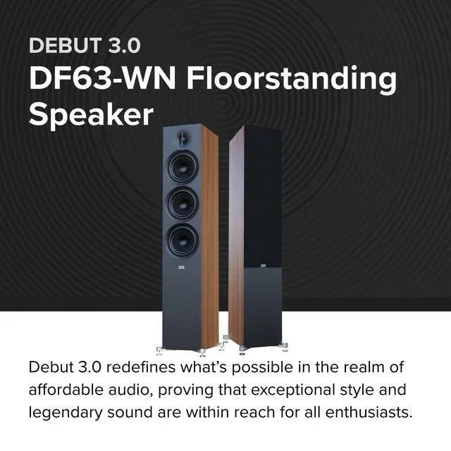 FLOORSTANDING SPEAKER - The new ELAC Debut 3.0 series redefines whats possible in the realm of affordable audio, proving that exceptional style and legendary sound are within reach for all enthusiasts. ^^ 3-WAY DESIGN - By assigning specific drivers to high, midrange & bass frequencies, each driver is optimized for the frequency range that best matches its design & material properties for overall better performance than a traditional 2-way design. ^^ ALUMINUM DOME TWEETER - The tweeter accurately reproduces high frequencies with clarity & detail for a more precise, immersive experience. The newly designed wave-guide & phase-plug allow for a wider dispersion pattern, ensuring consistent sound.
