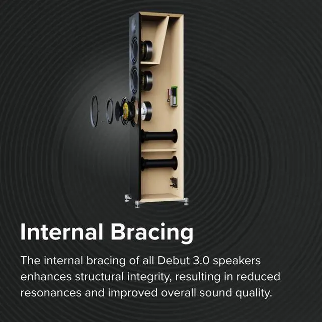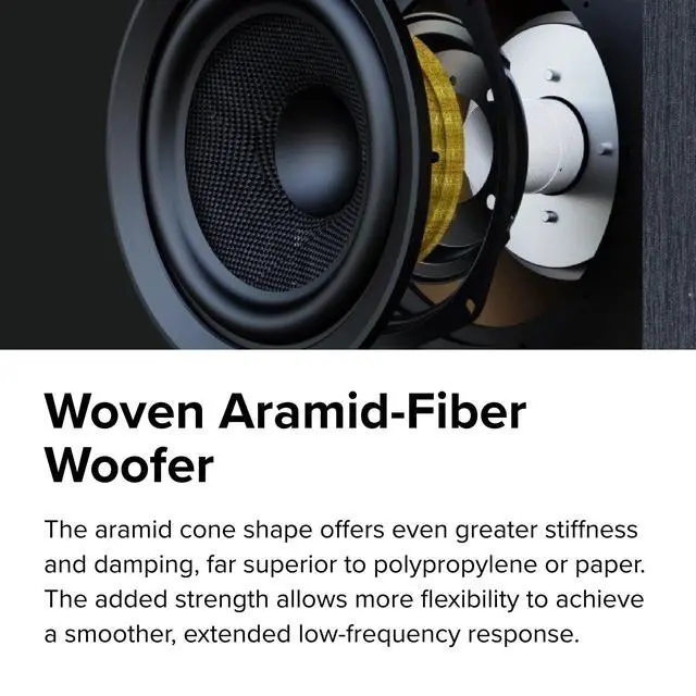 ^^ WOVEN ARAMID-FIBER WOOFER - The aramid cone material offers even greater stiffness and damping, far superior to polypropylene or paper. The added strength allows more flexibility in design to achieve a smoother, extended low-frequency response. ^^ INTERNAL BRACING - The internal speaker bracing significantly enhances performance. It reduces unwanted vibrations that can distort sound & ensures sound is primarily emitted from the speaker drivers (the woofer & tweeter) rather than the cabinet.