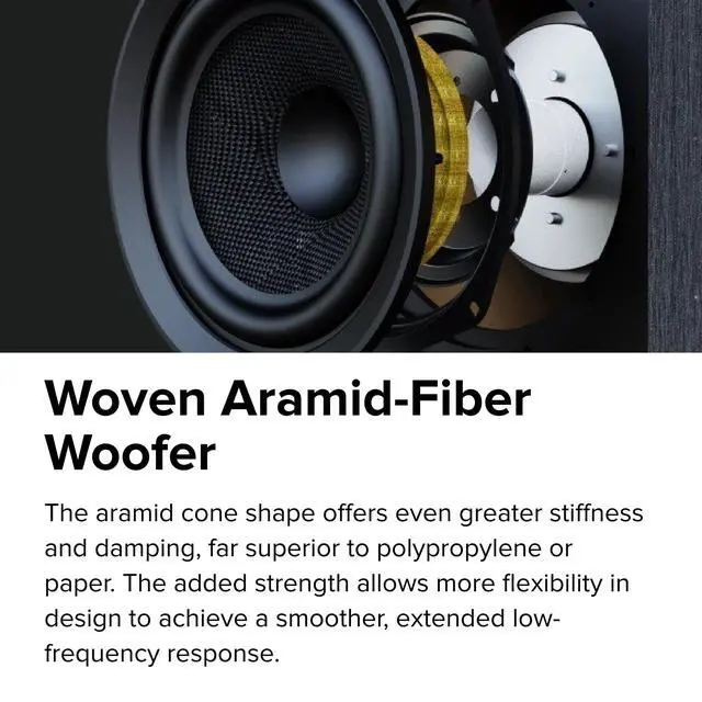 • WOVEN ARAMID-FIBER WOOFER - The aramid cone material offers even greater stiffness and damping, far superior to polypropylene or paper. The added strength allows more flexibility in design to achieve a smoother, extended low-frequency response.