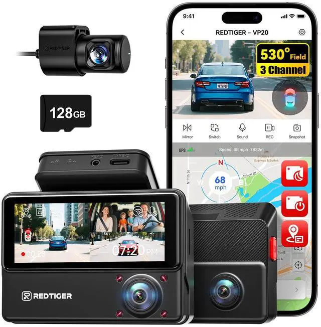 Paired with IR and 6-glass lenses, this REDTIGER dash camera captures clear front and rear footage day or night. Perfect for rideshare, carpooling, or parents monitoring their baby in the back seat. ^^ [Intuitive 3.18" Touch Screen Easy Operation] The REDTIGER Visionpano20 cam features a 3.18 responsive touchscreen, replacing traditional buttons for fast and easy control. Adjust settings, manage recordings, and replay videos with just a tap. Enjoy a smarter, more user-friendly dash cam experience from installation to everyday use. ^^ [WiFi + GPS Smart Playback & Evidence] Connect the REDTIGER dash cam via WiFi to view, download, or share clips instantly using the mobile app.