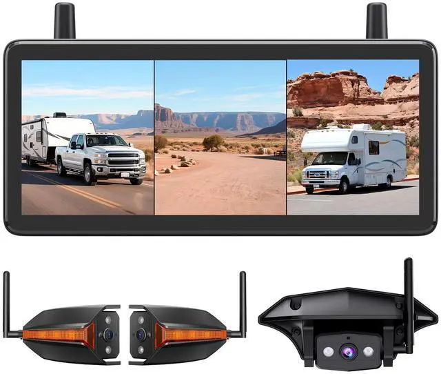 RV Safety: Get a wireless backup camera setup that gives you a full rear and side view. The wide coverage helps eliminate blind spots and prevent hitting roadside curbs or stones while backing into campsites or maneuvering through tight spaces ^^ Triple-Split