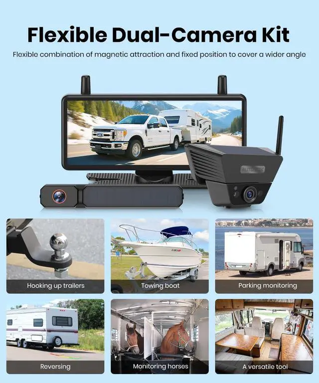 Flexible Dual Cameras: The solar backup camera is your everyday helperalways ready in reverse with no frequent re-mounting hassle. The second trailer wireless camera adds flexibility, moving easily between trailers, campers, or other tow vehicles whenever needed ^^ 3