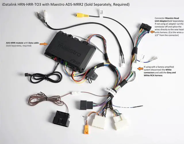 INSTALLATION NOTE: This HRN-HRR Plug & Play T-Harness REQUIRES an Idatalink Maestro Interface Module (ADS-MRR or ADS-MRR2) and the corresponding Idatalink Maestro Car Stereo Head-Unit ACC-HU-ALP1 (Alpine), ACC-HU-PIO1 (Pioneer), ACC-HU-SON1 (S0NY), ACC-HU-KEN1 (KENWO0D/JVC with 22-Pin Connector), ACC-HU-KEN2 (KENWO0D/JVC with 16-Pin Connector), ACC-HU-KEN3 (2024 & Newer KENWO0D/JVC with 22-Pin Connector), ACC-HU-BOS1 (BOSS Radio) or the ACC-HU-JEN1 (Jensen) Installation T-Harness. Each Sold separately. These adapters allows you to connect select car stereos to compatible iDatalink T-harnesses.