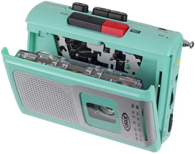 Jensen CR-100TE Teal Personal Cassette Player/Recorder is both portable and convenient. It also includes an AM/FM radio, so take it to the beach, the ball game, or anywhere else you want to listen to your favorite radio station, play old mix tapes, or audiobooks. Enjoy clear, static-free audio from the built-in speaker, and record from the radio or by using the built-in condenser microphone.