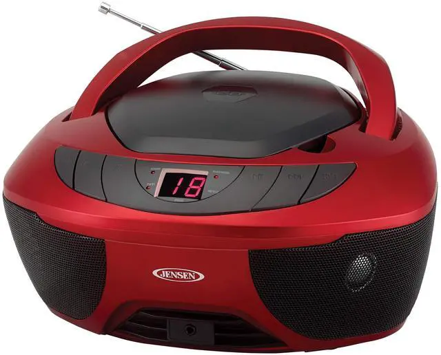 CD-475SR (Red) Limited Edition. Jensen CD-475S Portable Sport Stereo Boombox CD Player with AM/FM Radio and Aux Line-in & Headphone Jack (Red) Experience great sound with the JENSEN CD-475 portable CD music system. This device may look like a traditional boombox, but it is jam packed with features that will make listening to your favorite tunes easier and more enjoyable than ever before. Play music from a CD, AM/FM radio, or connect your iPod, MP3, or other digital audio players to the auxiliary input jack. When you power on your device, find all your favorite tracks, stations, and audio settings stored into the units programmable memory.