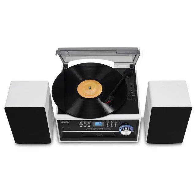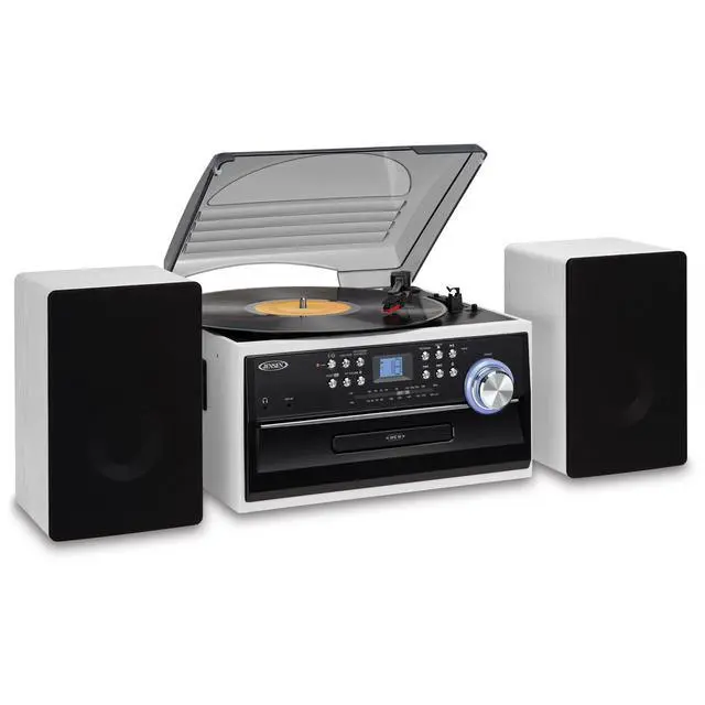 Dust off your records, compact discs, and cassette tapes and start listening to all your favorite music on the JENSEN JTA-475 3-Speed Belt-Driven Stereo Turntable. This unit comes with a CD player, cassette deck, AM/FM radio, and plays records at 33/45/78 RPM. The turntable features a built-in pitch control and allows you to fine tune the record speed faster or slower for the perfect playback. You also have the option of listening to your iPod, MP3, or other digital audio players through the convenient auxiliary input jack connection. Listen through the speakers or your own stereo headphones (not included).