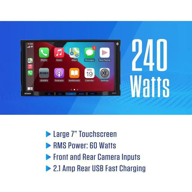 7 INCH LED HIGH RESOLUTION TOUCH SCREEN (1024 x 600) The 7-inch LED high resolution touch screen display provides a comfortable viewing experience while keeping all your favorite content within fingers reach. ^^ APPLE CARPLAY CarPlay is the smarter and safer in-vehicle interface to operate your iPhone, and the experience is taken to another level when featured in the J3CA7W multimedia receiver. Simply talk to Siri or touch the receivers display and get directions from Apple Maps, make phone calls, listen to voicemail, send and receive texts, and listen to music all in a way that allows you to stay focused on the road.