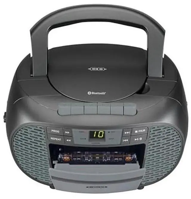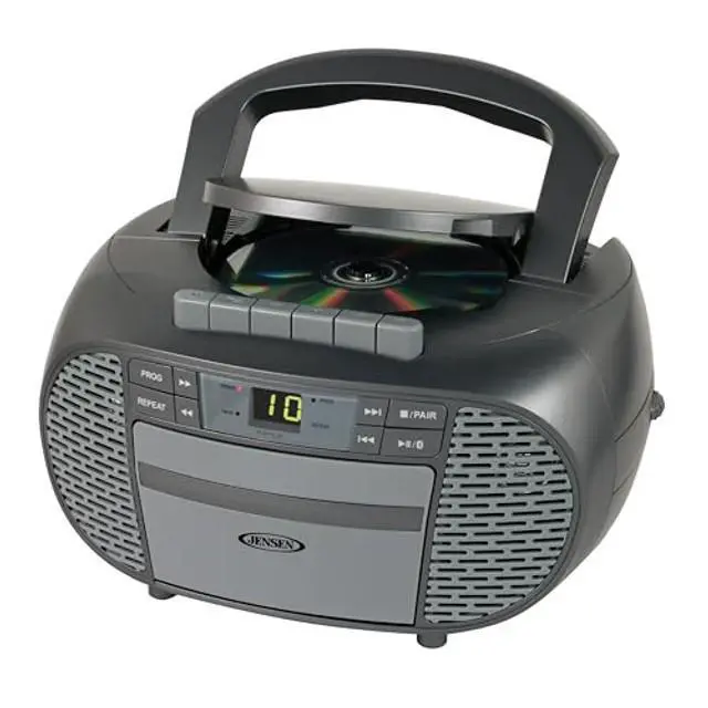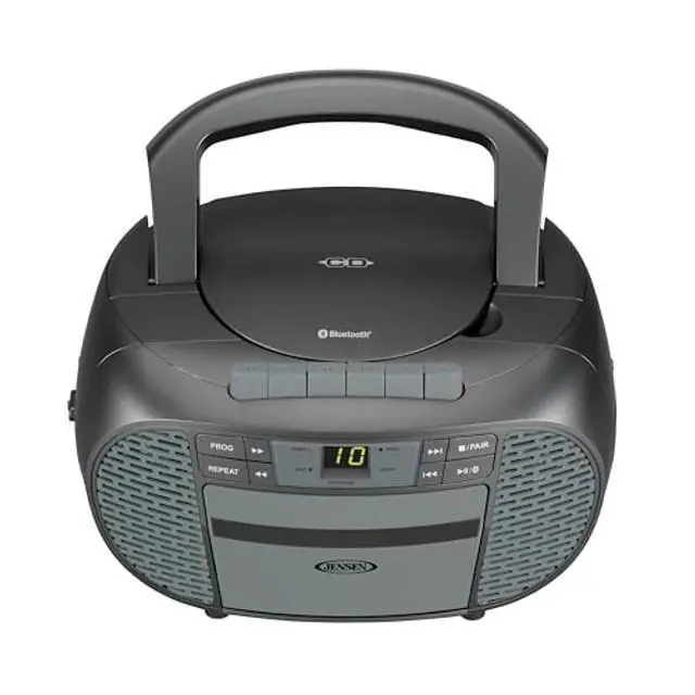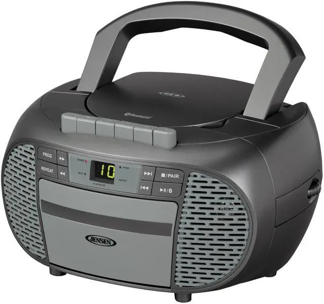 The JENSEN CD-550-GR Portable Stereo Bluetooth Compact Disc Cassette Recorder is the perfect all-in-one music solution for any space. Designed for versatility and convenience, this Jensen Radio lets you enjoy your favorite CDs, cassettes, or AM/FM stations anywhere. With Bluetooth functionality, it transforms into a Bluetooth enabled Radio player that can wirelessly stream your digital music. The units top-loading CD player supports CD-R and CD-RW formats, while the built-in cassette recorder enables one-touch recording. Its green LED track display and stereo speakers enhance your listening experience with clarity and ease of use.