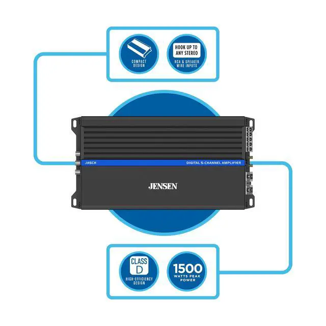 CLASS-D 5-CHANNEL AMPLIFIER - The JA5CH amplifier is designed for superior performance and versatility. This amplifier powers up to five channels, with bridgeable options for subwoofers and stereo configurations. Whether youre looking to drive four speakers and a subwoofer, or bridge channels for a more powerful setup, the JA5CH delivers consistent, high-quality power. ^^ CLASS-D EFFICIENT DESIGN - Produces 1, 500 Watts peak power, 70 Watts RMS x 4 channel + 240 Watts RMS x 1 @ 4 ohms, 100 Watts RMS x 2 channel + 350 Watts RMS x 1 @ 2 ohms and 200 Watts RMS x 2 channels @ 4 ohms (Bridged).