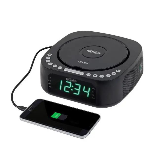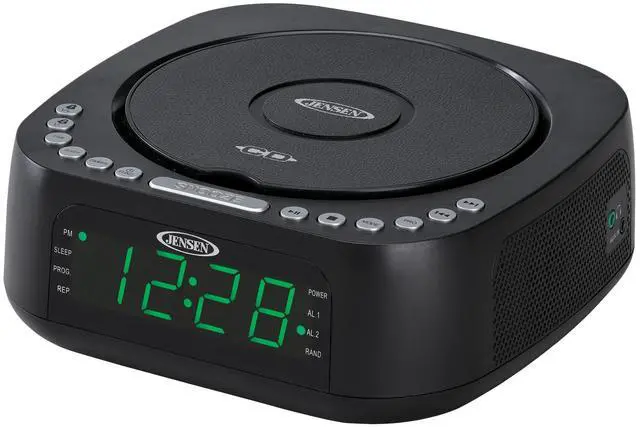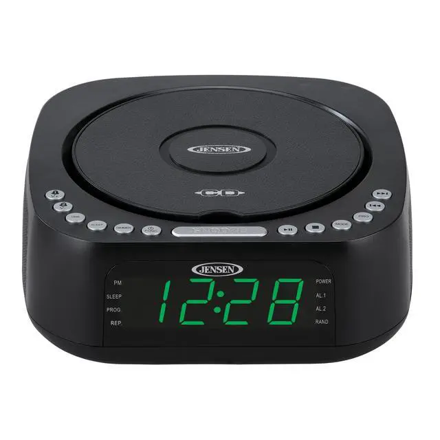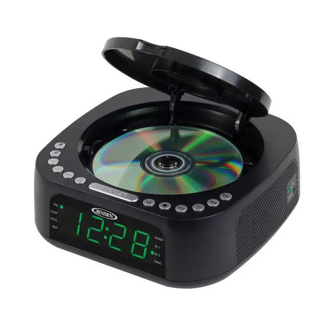 The JENSEN JCR-375BK Limited Edition Stereo Digital Dual Alarm Clock Radio with CD Player is the perfect all-in-one device for your nightstand or anywhere in the house. The top-loading CD player provides versatile playback options, and plays both store bought or custom recorded CD-R/CD-RW discs, including those with MP3 music files. The unit also features a digital FM radio that can store up to 20 FM presets for easy access, a bright and easy to read Green LED display, an auxiliary input for connecting a digital audio player and a headphone jack for private listening.