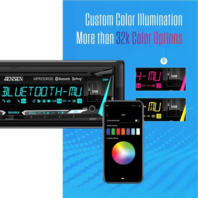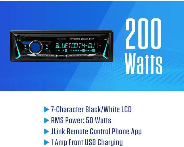 12 CHARACTER LCD WITH UPGRADED FEATURES - Designed to replace existing, older single-DIN head units in order to add updated features such as Bluetooth and smartphone compatibility. ^^ PUSH-TO-TALK - Communicate via your phone's Bluetooth connection. Interact with your smartphone's assistant while you drive with only a push of a button. ^^ 200 WATTS PEAK POWER - 50 watts maximum x 4 channels output power plus 2 pairs of 2-volt preamp outputs for speakers. ^^ BLUETOOTH CONNECTION - Safely answer and make calls from your receiver using touchscreen icons and the included microphone. ^^ RGB ILLUMINATION - Choose from built-in color presets or use the J-Link Smart Remote app to develop your own color with over 32, 000 combinations.