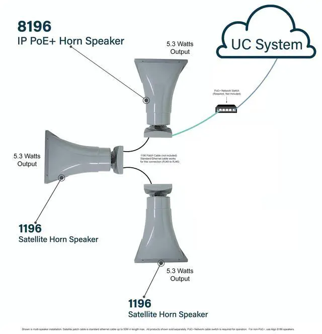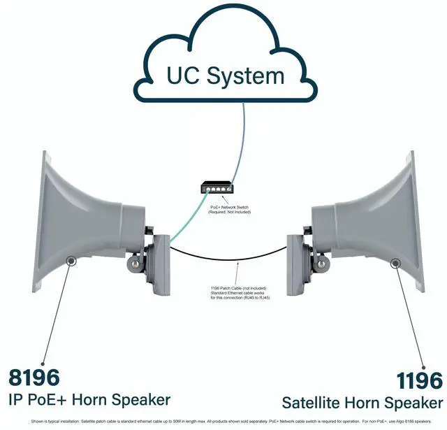 The Algo 8196 SIP PoE+ Paging Speaker and IP Loud Ringer can operate individually or can support up to three daisy-chained Algo 1196 Satellite Speakers for cluster and multi-speaker installation (see images). Daisy-chain requires directly wiring speakers to each other (not through network). The Algo 8196 features 50 SIP paging extensions plus 10 Alerting/Ring extensions with multicast scalability for voice paging, music and audio broadcasts, and notification capability. The Algo 8196 requires the installer to connect the unit to PoE+ power for full capability. Extensions can be registered with most any premise or hosted Communication Server supporting 3rd party SIP endpoints independent of a telephone (no IP telephone is required).