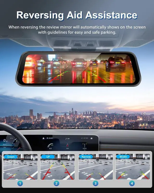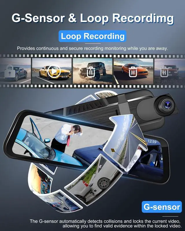 WDR & Super Night Vision: The rearview mirror dash cam is equipped with an improved low-reflectivity LCD screen that minimizes glare during the day. Additionally, it uses advanced WDR technology to balance light levels for superior image quality. As a result, driving in low-light conditions or other challenging lighting situations should be much easier. ^^ 24H Parking Monitor - Our rearview mirror dash cam offers all-the-day parking monitoring, ensuring your vehicle is protected day and night. With features like time-lapse recording, it efficiently compresses video footage, conserving power and storage space without compromising security. An extra ACC hardwire kit is needed for this function ^^ Loop Recording & G-sensor Function - Provides continuous and secure recording monitoring while you are away. The dash cam records in a loop every 1/2/3 minutes until the oldest videos are overwritten by new ones. The G-sensor automatically detects collisions and locks the current video, allowing you to find valid evidence within the locked video. ^^ Neat Functionality & Easy InstallationThis 9.66" IPS touchscreen smart rear view mirror dash cam supports G-sensor, loop recording, view angle adjustment, split-screen display, sound recording, screen saver, and brightness adjustment, very convenient to use, and this universal digital rear view mirror 4k is also easy to install, no matter what the car model, it only takes 20-30 minutes to fix the mirror dashcam and connect the power cable and rear camera to complete the installation.