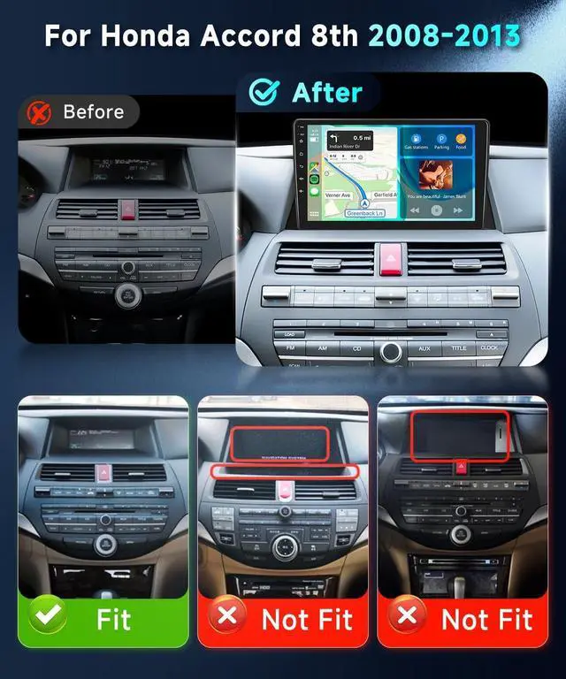 Honda Accord: This double din Car Stere Replacement fits for Honda Accord 8th Radio 2008 2009 2010 2011 20121radio. See the picture for more applicable models. Please check the year/dimensions/shape of the center console of your vehicles before purchasing. If you are not sure, you can tell us, we will give you advice ^^