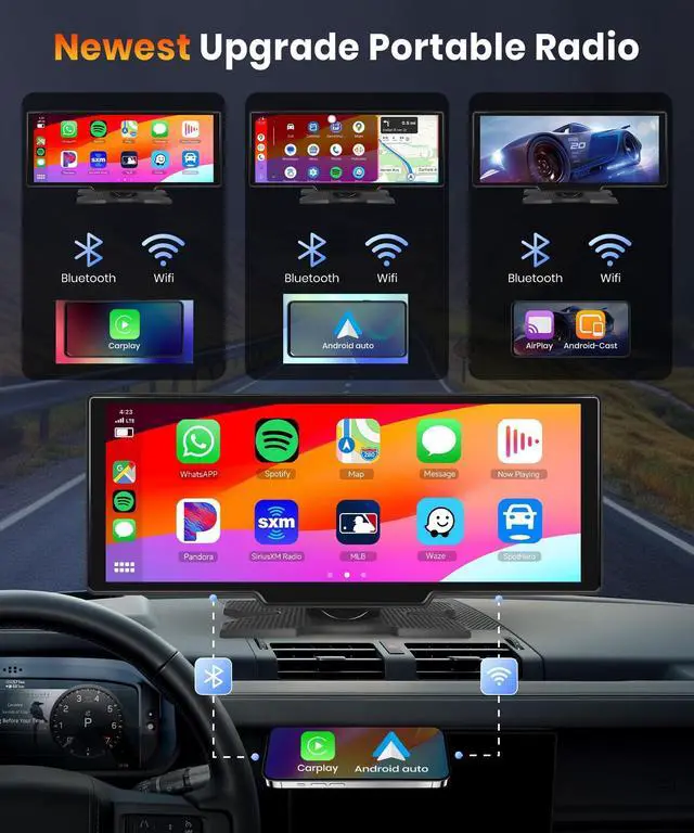 Upgraded Soft Bottom Bracket: The android auto screen is compatible with 7-32V vehicles for easy plug-and-play installation via cigarette lighter power without removing the factory stereo, making this portable carplay screen an affordable add-on display for cars, RVs, trucks, SUVs, Pickups and more. The upgraded soft bottom support bracket provides enhanced stability. You can also change a telescopic support bracket--Package not included ^^ Upgraded