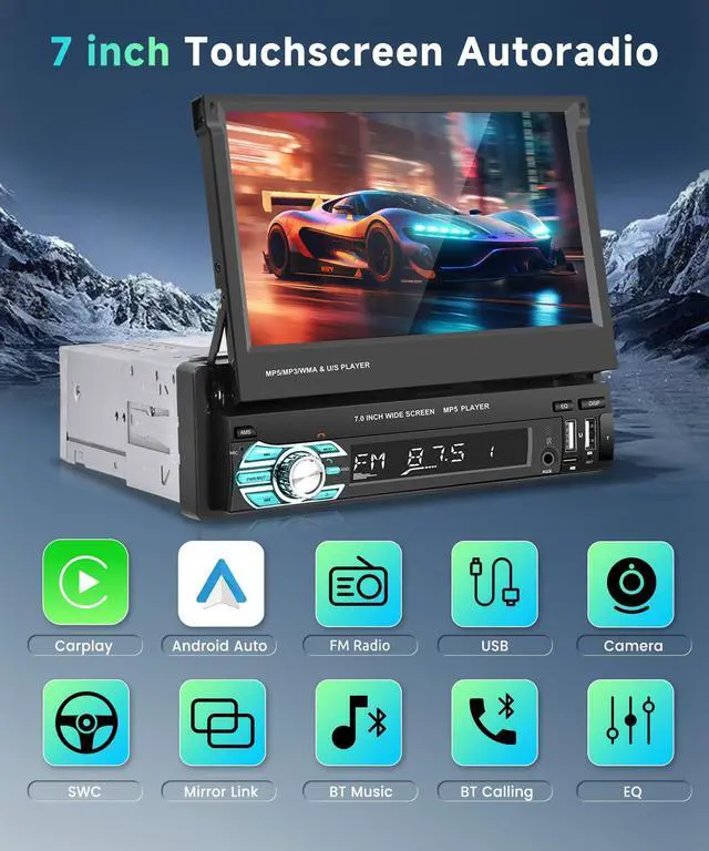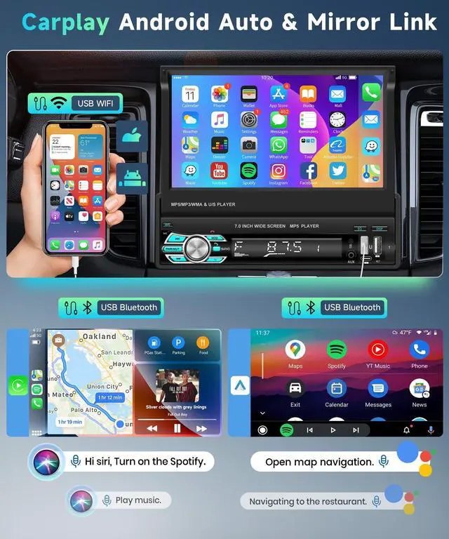 Android Auto: Connect your iPhone or Android phone to access maps, music, contacts, and more on the single din car stereo. CarPlay and Android Auto work wired or wirelessly, so you can stay focused on driving. Voice assistant lets you drive hands-free and enjoy the ride ^^ 7 Inch Flip Out Screen /