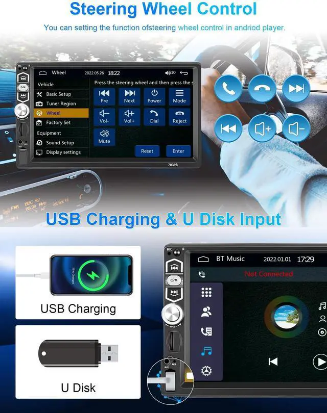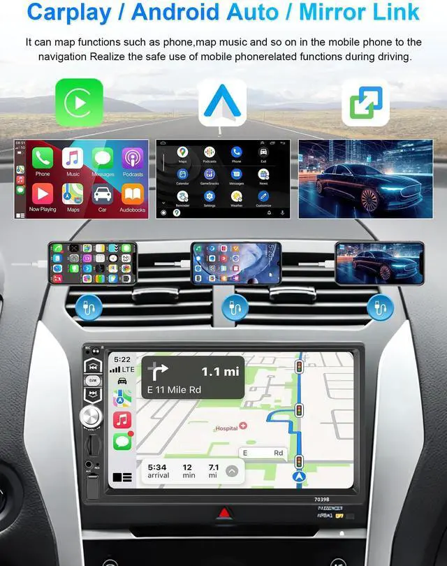 Single Din Car Stereo with Carplay and Android autoThis bluetooth radio support carplay and android auto functions. Just connect with mobile phone via USB data cable, then you can access mobile phone contacts, email, notification, map navigation, music, video and other information, and also implement voice control. ^^ Android/IOS Phone Mirror LinkSingle din carplay radio supports Android ( 11.0 and below) two-way connection, IOS( 13.4 and below) one-way projection to the car headunit. You can watch the video on the stereo after connection. You can cast all the functions which you want on your phone to this audio's screen.